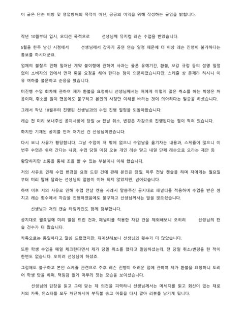 선생님께서는 저의 당일 레슨 취소건을 언급하셨지만 전 당일 취소/변경을 한 적이 한번도 없습니다. 이 부분은 도대체 어느 부분과 헷갈려서 허위 사실을 말씀하며 저를 탓하시는 건지 여태 의문입니다.
