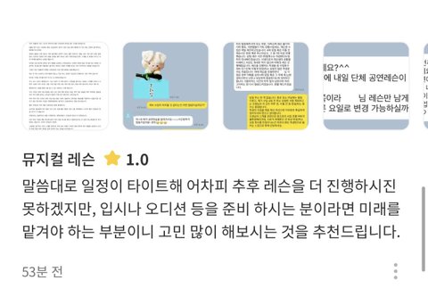 해당 선생님은 '숨X' 라는 구인 플랫폼을 통하여 고용했고, 뮤지컬 부문 강남구 고용 1위라는 명성에 걸맞는 수많은 별점 5개 짜리 후기와 더불어 포털 사이트에 뜨는 프로필을 믿어 의심치 않고 제 미래를 맡겼습니다.