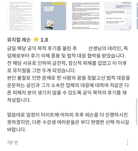 타 과를 졸업 했음에도 불구하고 뮤지컬 배우가 되고 싶다는 일념 하나로 빛 좋은 개살구 격 후기에 속아 고용한 제 인생 첫 뮤지컬 레슨 선생님이었기에 그만큼 믿고 따랐으나 그 흔한 사과 한마디 받지 못한 채 이런 말로를 맞게 되어 굉장히 불쾌한 마음이며, 환불을 받았음에도 불구하고 전 지금 한창 미래를 준비하기에도 모자란 시간에 모든 플랜이 꼬여 심리적, 금전적 피해를 입은 상태입니다.