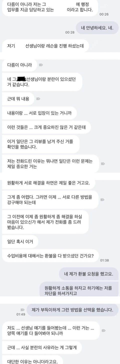 리뷰를 올림과 동시에 모르는 번호로 전화가 왔고, 선생님 측 행정 담당 직원이라 칭한 대리인은 저에게 계속된 리뷰 삭제 종용을 했으며 제가 삭제할 의사가 없음을 밝히자 법적 조치라는 단어를 운운하며 협박하였습니다. 통화 녹음을 진행했으며, 녹음본을 대화체로 추출한 내용도 함께 첨부해두도록 하겠습니다. 인공지능으로 인식한 부분이라 대화체가 매끄럽지 않은 점 양해 부탁드립니다. 흔한 사과 한마디 없이 법적으로 해결 방법을 보겠다 하심에 이 또한 순응하며 통화를 마무리 지었습니다.