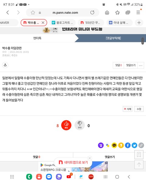 당시 김용호 연예부장이 다홍이랑 박수홍, 김다예 부부로 어그로 끌때라 박수홍 비판 받던 시기였는데 쓰니 혼자 옹호했더라