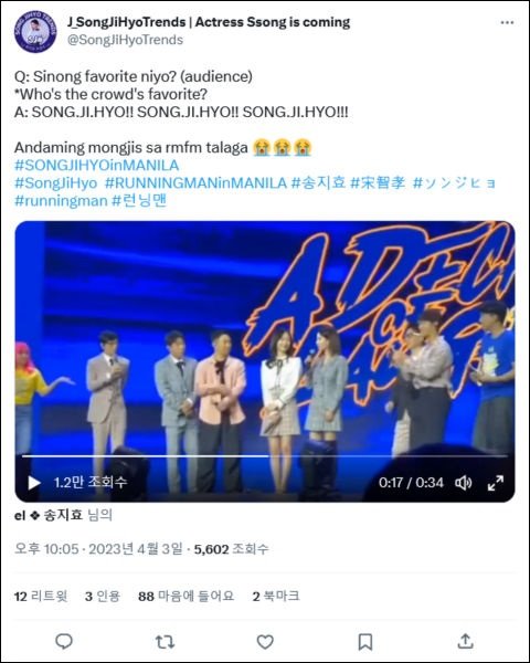 1줄요약: 송지효는 런닝맨 인기멤버 수준을 넘어 아시아 최고 한류스타 중 한 명임.