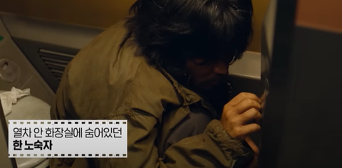 영화 초반에 한 노숙자가 기차 화장실에 있는 모습인데
