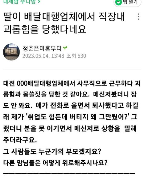 유방암 수술을 마친 딸이 첫 직장에서 직장내괴롭힘을 당했어요