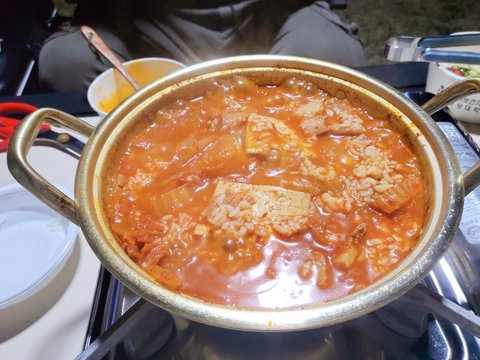 2차는 삼겹살을 넣고 김치찌개를 끓였어요