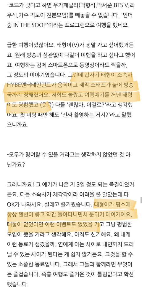 개이브가 왜 발빠르게 움직였는지 알겠네 태형이랑 우가팸은 가볍게 브이로그 느낌으로 찍으려고 했던것 같은데 갑자기 소속사직원 붙고 방송국 붙어서 당황했대 위버스도 아니고 매 월 결제하는 디플에 공개한것도ㅈㄴ씹스러움 돈 냄새는 ㅈㄴ잘 맡는게 지들이 태형이 아니면 저 슈스들을 어케 다 모으냐고ㅋㅋㅋㅋ그리고 저 때 자막도 ㅈㄴ씹스럽게 달아서 걍 저 회사는 가수방패가 일상인가 싶고 가수를 돈으로만 보는 것 같음 가수 보호만 잘 하면 지갑은 저절로 열려요 개이브 ㅂㅅ들아 사생 잡고 비공갤줌 잡고 짹에 멤까하는 알계들이랑 악개들 좀 잡고 어?