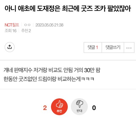 애초에 2022초까지 굿즈 비슷했고 1년 1컴백 퀄똥망vs1년 3컴백으로 푸쉬그룹이 바뀐후에 굿즈순 저렇게 바뀐건데 뭔;;그리고 이번엔 도재정냈으니 도재정이 높은거고.. 그땐 도재정으로 드림 웅앵 없었음 이번에도 도재정이랑 꼬마즈 합산 굿즈 차트같은거 아무도 안만들었잖아? 슴 원래 푸쉬순으로 인기 만들어져서 조용한데 맠크트는 왜 드프코스함? 지ㅅㄲ 1차 꼬마즈랑 솔로 쳐망하니까 허겁지겁 나온지 하루되자말자 도재정 md 굿즈발매랑 거의 텀도 안나는거 만들어온거봐ㅉ수치스러움 잘난 칸예후예 마크나 빨아