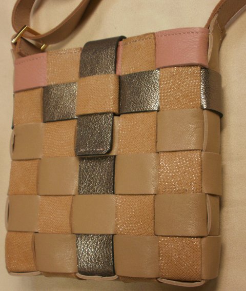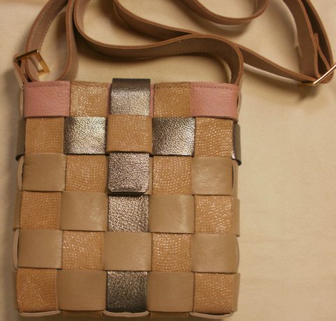 베이지 컬러,블랙 펄, 핑크 컬러의 양가죽을 콜라보로 엮어서 제작한 매쉬 미니 숄더 백입니다.(마디샤 가죽공예)
