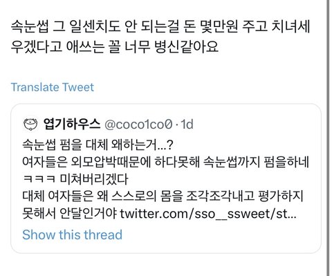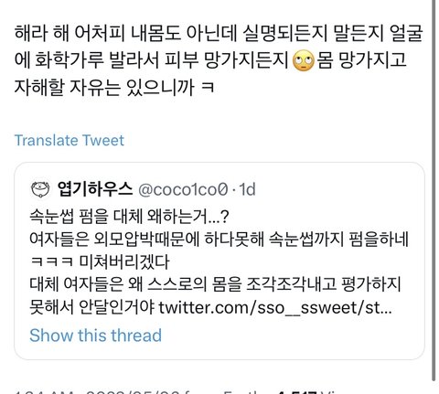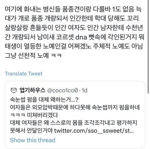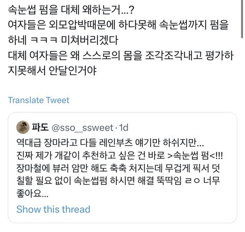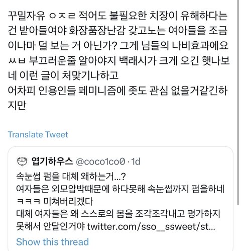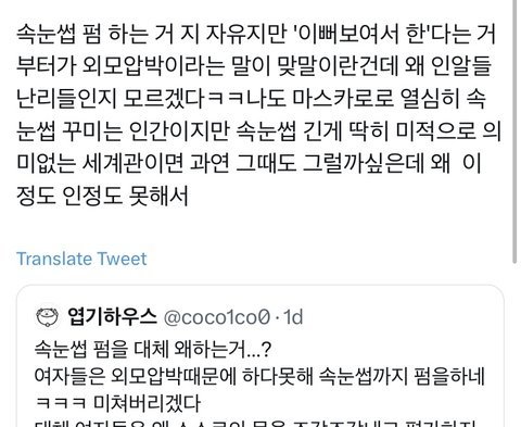인용 보면 다들 속눈썹펌 한 여자들 단체로 패고있음 무엇보다 여성인권에 민감한 사람들이면서 이렇게 여자를 패는건 너무 모순 아니냐 코르셋 조이면서 한1남 만나서 한1남유충 낳아라 이러고 있는데 개충격적임 여기에 반발하는 사람들을 이상한 사람 만듦