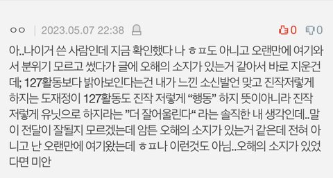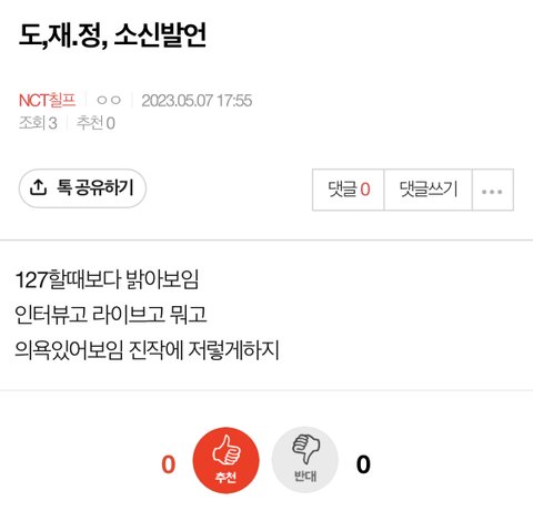 주절주절 혼자 문맥 창조해가며 파생글에 또 댓글 싸고 튀었는데 항상 의욕 충만했던 애들한테 의욕 있어 보인다고 하고 그 개소리에 대한 변명은 한줄도 없는 반면 오해의 소지가 있다는 말 2번(수정함 3번이래), 해찬팬 아니라는 말만 2번씩인 거 보니까 무슨 말이 하고 싶은지 알겠지? 다른 커뮤에서도 똑같은 말 계속 하고 다니면서 자아표출하는데 이렇게 구라치면 누가 속을 줄 아나