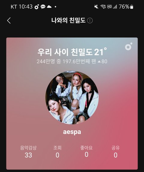 노래도 좋고 컨셉도 좋고 무엇보다 멤버들이 너무너무너무너무 예쁨 가사도 뇌절 없어서 좋음 평생 이 컨셉으로 갔으면 좋겠다 하이틴같은데 유치하진 않고 에스파만의 센 컨셉도 있으면서 중독성있는 노래로ㅠㅠㅠ이번 활동 미친듯 참고로 팬 아님