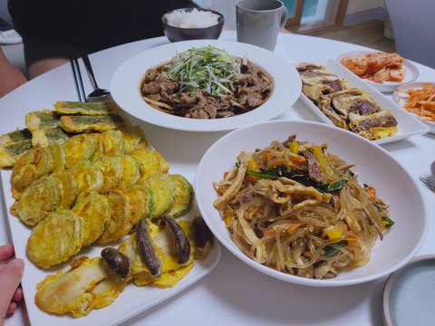 애호박전, 깻잎맛살전 버섯전, 소불고기, 잡채, 새송이한우전