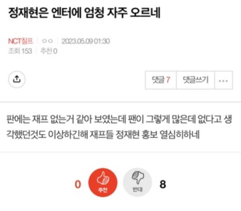 이럴려고 어제 재현까는 톡선 썼겠지 프라다글 못올라오게하려고 ㅋㅋ3일에 한번은 무슨 재현쳐도 갤련이 쓴 여돌망붕,집안루머까글,외모까글만 나오는데