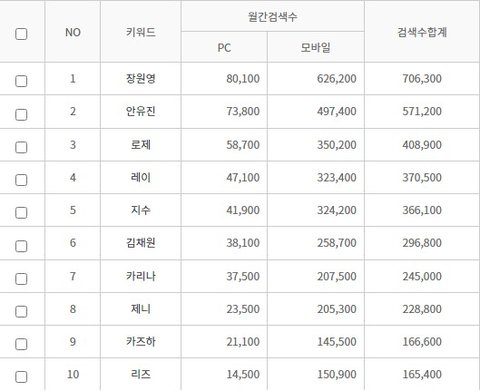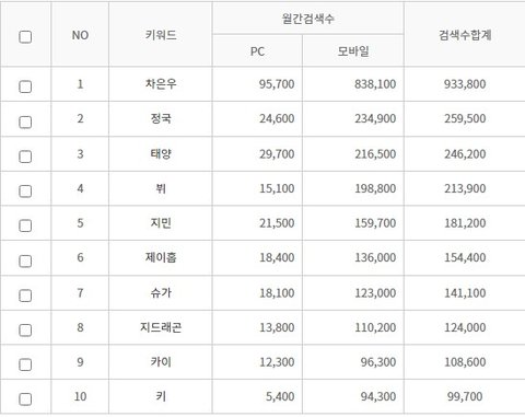 남자는 방탄, 여자는 아이브 멤버들 검색량이 많음