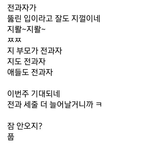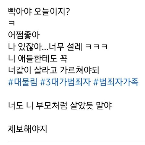 이게제정신인건지 아이들.부모님까지 들먹거리고 거짓말로 남들 현혹시키며 정말제가 무슨 강력범죄자인냥 우리집안이 무슨 범죄자집안인냥 초등고등아이까지 건드리는데