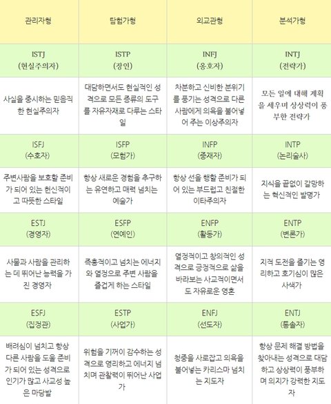 가령 자신이 ESTJ다 라고하면 딱 그거만 보는게 아니라 아래랑 위쪽 전부다 해당됩니다.