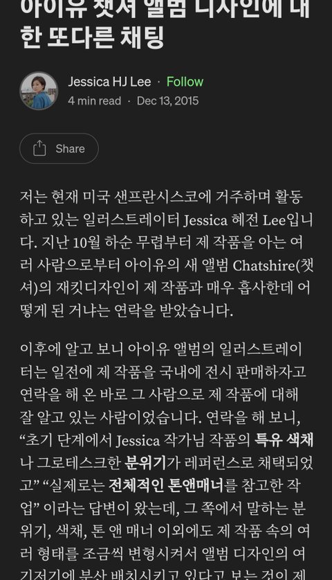 아이유 챗셔 앨범 디자인에 대한 또다른 채팅 https://medium.com/@jessicahjlee/%EC%95%84%EC%9D%B4%EC%9C%A0-%EC%B1%97%EC%85%94-%EC%95%A8%EB%B2%94-%EB%94%94%EC%9E%90%EC%9D%B8%EC%97%90-%EB%8C%80%ED%95%9C-%EB%98%90%EB%8B%A4%EB%A5%B8-%EC%B1%84%ED%8C%85-e75547781f16
