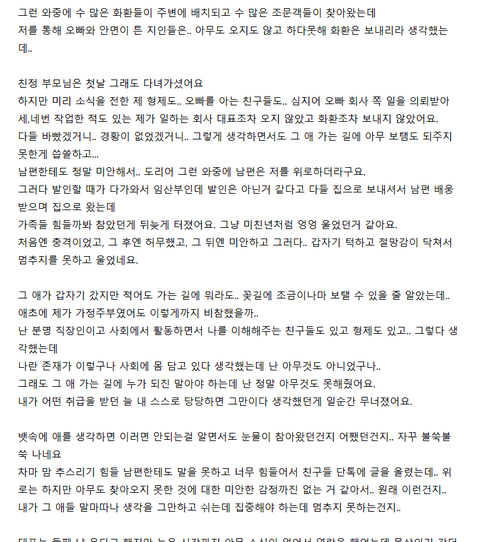 남편도 시부모님도 심정이 어떨지, 저도 이렇게 힘이 드는데 상상이 안되서 늘 조마조마했어요.당차고 밝았던 어머니는 금방이라도 실신하실듯 목놓아 우시고, 근엄하지만 상냥하신 아버님도 눈물을 보이시고, 오빠는 얼굴이 벌게질지언정 계속 울음을 삼키니.. 모두가 너무 안쓰럽고 제가 당장 할 수 있는게 없어서 답답했어요. 더구나 임신 중이라 가족들도 친척분들도 다들 무리못하게 계속 누워있으라고 앉아 있어도 오래 앉으면 배가 눌려서 힘들다고 또 눕히시고,반찬은 아예 나르지도 못하게 철벽치고 다들 막으시고,제가 크게 할게 없더라구요. 그래서 더 미안했어요. 그 애한테