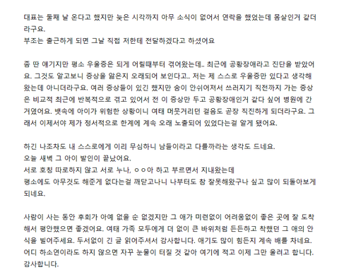 좀 딴 얘기지만 평소 우울증은 되게 어릴때부터 겪어왔는데.. 최근에 공황장애라고 진단을 받았어요. 그것도 알고보니 증상을 앓은지오래되어 보인다고.. 저는 제 스스로 우울증만 있다고 생각해왔는데아니더라구요. 여러 증상들이 있긴 했지만 숨이 안쉬어져서 쓰러지기직전까지 가는 증상은 비교적 최근에 반복적으로 겪고 있어서전 이 증상만 두고 공황장애인거 같다 싶어 병원에 간거였어요. 뱃속에 아이가 위험한 상황이니 여태 머뭇거리던 걸음도 곧장 직진하게 되더라구요. 그래서 이제서야 제가 정서적으로 한계에 계속 오래 노출되어 있었다는걸 알게 됐어요.하긴 나조차도 내 스스로에게 이리 무심하니 남들이라고 다를까라는 생각도 드네요.오늘 새벽 그 아이 발인이 끝났어요.서로 호칭 따로하지 않고 서로 누나, ㅇㅇ아 하고 부르면서 지내왔는데평소에도 아무것도 해준게 없다는걸 깨닫고나니 나부터도 참 잘못해왔구나 싶고많이 되돌아보게 되네요.사람이 사는 동안 후회가 아예 없을 순 없겠지만 그 애가 미련없이 어려움없이좋은 곳에 잘 도착해서 평안했으면 좋겠어요. 여태 가족 모두에게 더 없이 큰 바위처럼 든든하고 착했던 그 애의 안식을 빌어주세요. 두서없이 긴 글 읽어주셔서 감사합니다. 애기도 많이 힘든지 계속 배를 차네요. 어디 하소연이라도 하지 않으면 자꾸 눈물이 터질 것 같아 여기에 적고 이제 그만 울려고 합니다. 감사합니다.