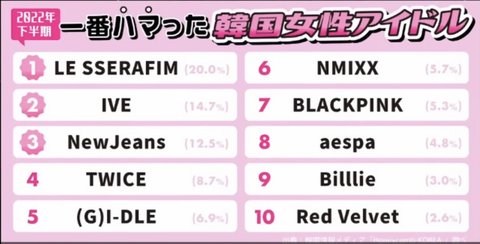 1위 트와 2위 있지 3위 르세라핌 4위 블랙핑크 5위 뉴진스 6위 아이브 7위 엔믹스 8위 에스파 9위 캐플러 10위 마마무