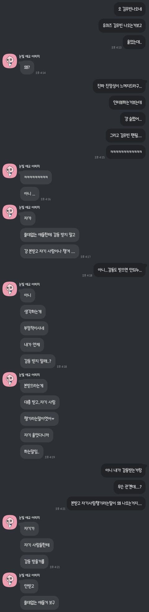 왼쪽 가스라이팅 지리네.. 감동 받은것도 잘못한거임..? 김우빈 팬미팅 쫓아다니고 김우빈 사생팬질 했으면 왼쪽 말이 맞는데 그냥 프로그램 하나보고 감동받았다 했는데 쓸데없는 연예인한테 감정 쏟지말고 주변 사람들한테 집중하란소릴 해버리네 ㄷㄷ