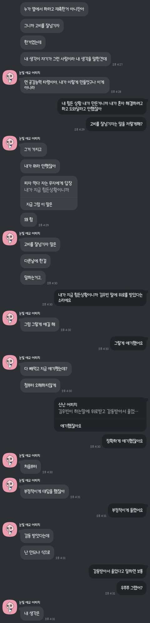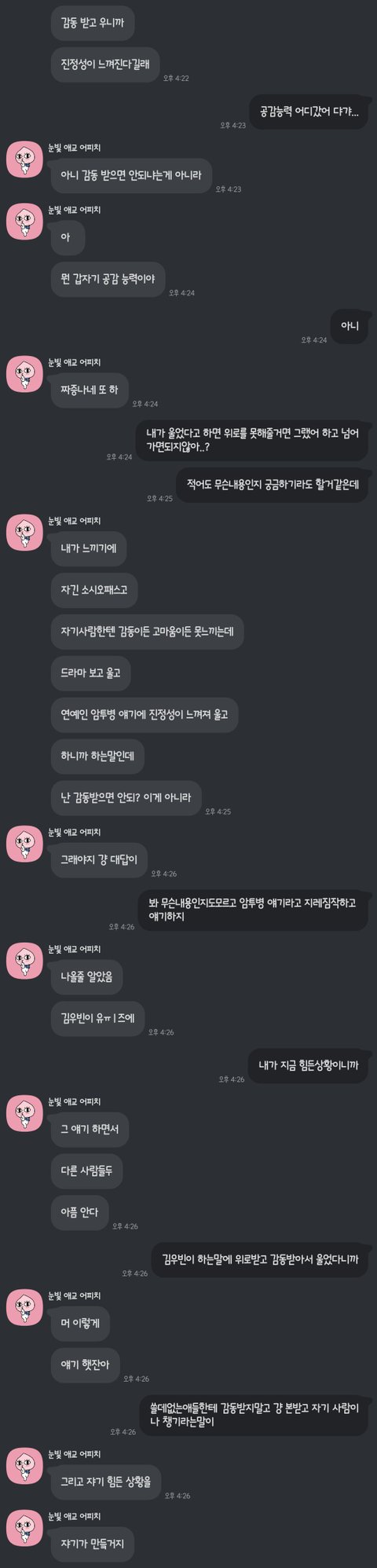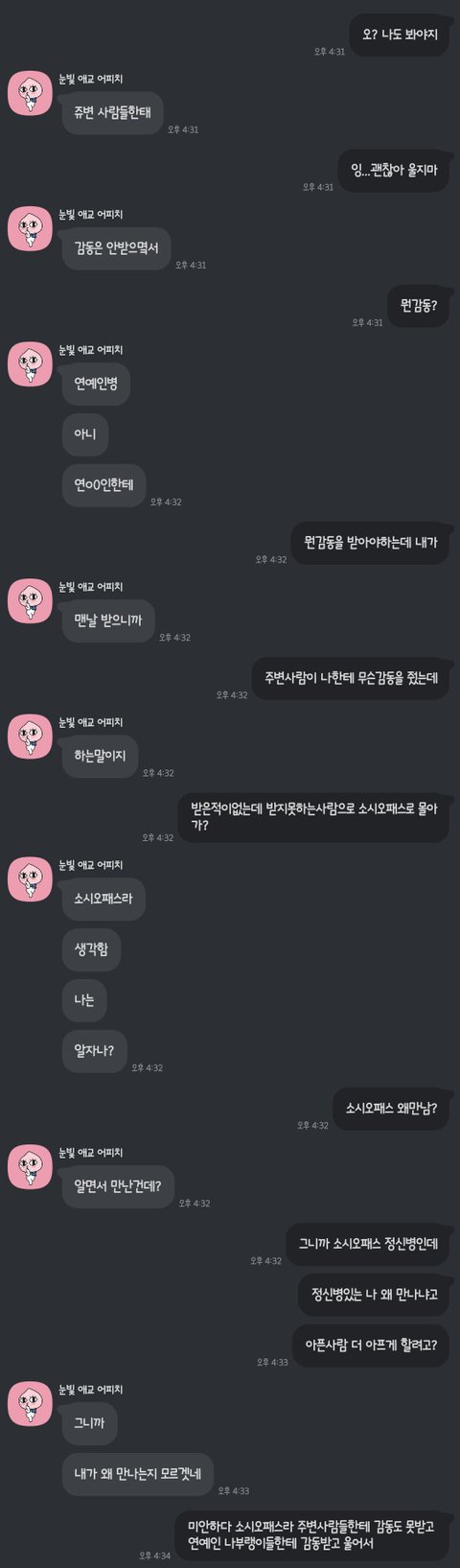 감동 받지 말라고 해놓고 바로 다음에 언제 감동 받지 말래? 이러네 ㅋㅋㅋ 연애는 고사하고 대화가 됩니까 저런 사람이랑? 지인으로도 못 지낼듯
