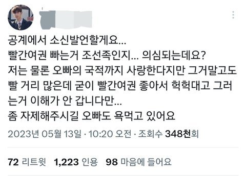 ㄹㅇ 그사람이 좋아서 국적이 상관없을수는 있으나 빨간여권 뭐좋은거라고 발린다네 어쩌네 하는건 선넘는것 같음