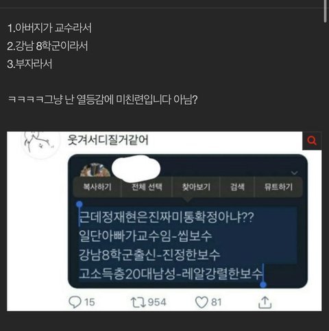 ->단 한번이라도 정치색 티낸적도 없는데 강남 출신이란 이유로 보수일거같다고 투표 시기만 오면 아무이유없이 몇천알티로 팸