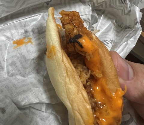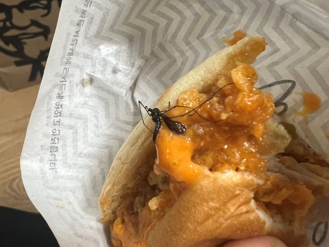 지난 5월 10일 수요일 퇴근 전 KFX 앱으로 햄버거 및 치킨 등을 주문하여매장에서 픽업을 하고 집으로 돌아와서 식사를 하는데,제가 주문한 스콜쳐 버거의 마지막 한입이 남았는데, 햄버거를 자세히 보니 웬 각다귀로 보이는 벌레의 사체가 치킨 패티와 뒤엉켜 있는 모습을 발견했습니다.미처 다 먹지 못한 음식들을 그대로 종이 백에 담아두고함께 식사 중이던 친구는 평소에도 비위가 약해서 바로 구역질을 하고저 역시 온몸에 소름이 돋을 정도로 불쾌함이 몰려왔습니다.
