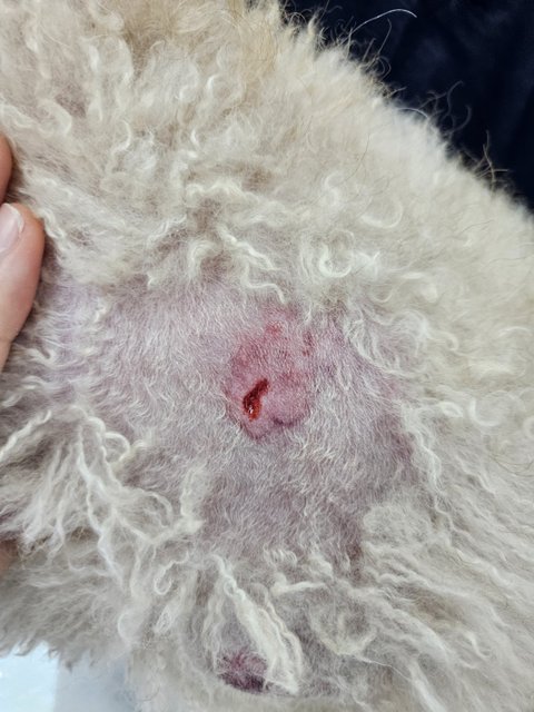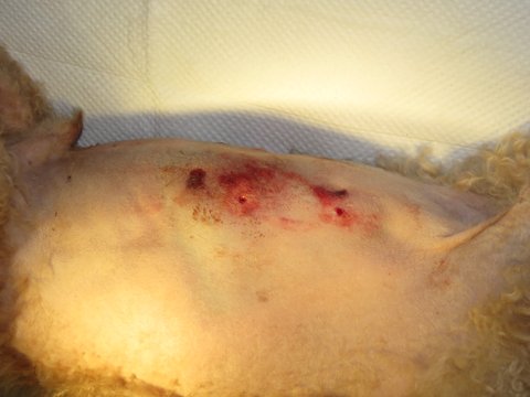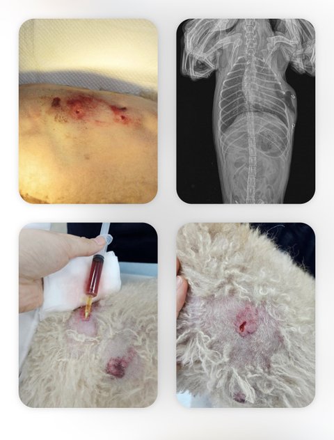 한마리는 큰 개에 물려 피범벅이 되었고,폐에 구멍이 뚫려 기흉이 생기며 수술을 하러 병원에 옮겨졌지만 결국 무지개다리를 건넜고 한마리는 아직도 큰 상처가 몸에 남아 치료중이며