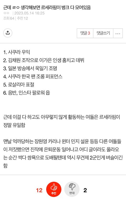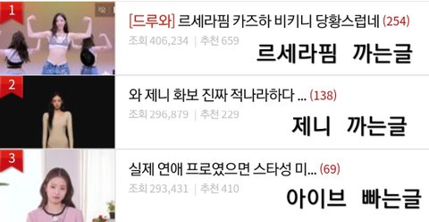 ??? 일부러 아이브 에스파 좋은글 있을때만 지가 의도적으로 캡쳐해와서 뭐함? 정작 '진짜'는 느그 르세라핌 아님? ㅋㅋㅋㅋㅋ 과연 아이브, 에스파가 니가수 병크목록중 단 하나라도 했다면 지금쯤 활동 가능했을거라고 생각함? 진짜 양심에 손을 얹고 말해봐 릇팬아