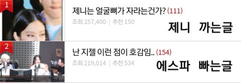 블핑 제니 뉴진스 르세라핌 있지 엔믹스는 빠는글도 없고 맨날 톡선에 까는글만 조카 올라오고 에스파 아이브 빠는글만 맨날 톡선 도배되면 여돌팬들이 보기에 누가 까는걸로 보이겠음?