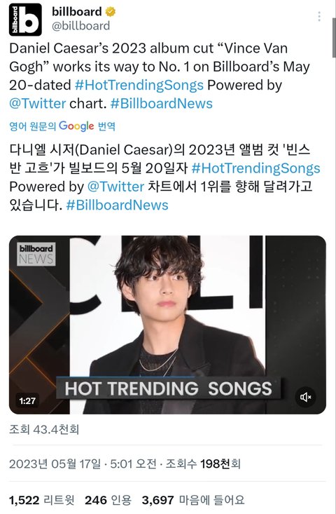 빌보드 핫트랜딩송 차트 1위래 지금 봤네 이런거 볼때마다 너무나 킹탄같음