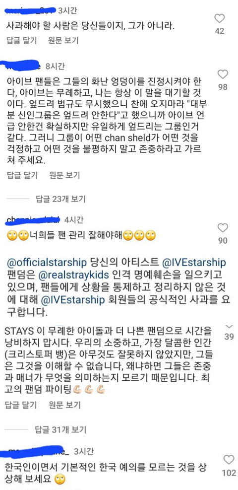 스키즈 외국팬덤들은 아이브 인스타 몰려가서 테러하고 사과요구함