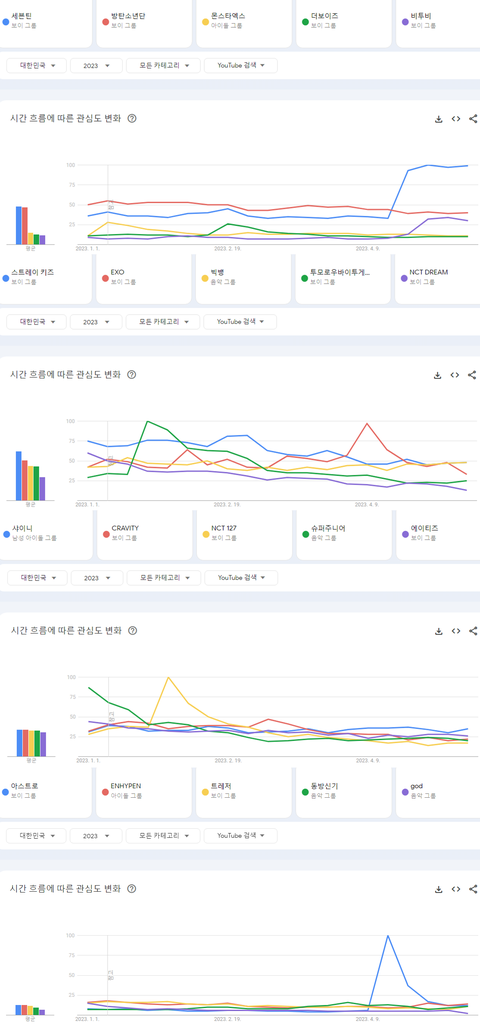 2023년 현재까지 국내 유튜브에서 가장 많이 검색된 케이팝 남자아이돌그룹 TOP20