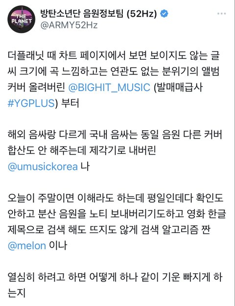 악개줌들 싸불에 시달려 외퀴들 싸불에 시달려 난 진짜 최근에 넴드들 몇 분 계폭하신 거 보고(물론 몇 분은 다시 돌아오시긴 했지만) 음정팀도 갑자기 사라질까봐 ㅈㄴ 걱정됨 뭐 누가 돈 주고 시키는 일도 아니고 이렇게 자발적으로 팀 구성해서 팬들 독려시키고 차트분석하는 거 모든 팬덤 통틀어서도 거의 유일무이함 성적이라도 뜻대로 나오면 우리도 음정팀 입장에서도 조금이나마 힘이 날 텐데 스밍 제발 놓지마ㅠㅠ싸불하는 계정 보이면 무조건 개패주고