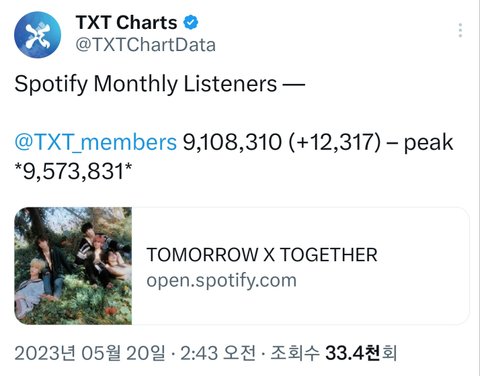스포티파이 월간청취자수 늘은거 봐 슈러라컴백 때 국내 모아들 진짜 열심히 해줬는데 이번엔 해외 모아들이 열심히 해줘서 너무 좋다 툽뽕찬다♡ 뫄이팅♡