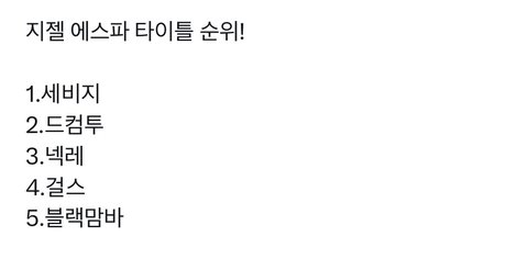 근데 에스파 개웃긴 게 바로 걸스 컴백 전인데 다 하위권에 넣음 ㅋㅋㅋㅋㅋㅋㅋ 개솔직해 ㅋㅋㅋ