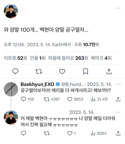 탈덕문 쓴 애가 찐 백현팬이나 엑소팬 아니고 여시나 쭉방에 상주하는 정병인거 앎 여기뿐만아니라 여시 쭉방도 비슷한 맥락으로 백현까고 다녀갔음 정병들이 하는 말 한 귀로 듣고 한 귀로 흘리면 되는데 혹시나 저걸 곧이 곧대로 믿는 몇몇 사람들이 있을까봐 그리고 새벽부터 지금까지 열두시간을 댓글에 상주하는 정병들 때문에 씀 작작해라 진짜 니들 인생이 ㅎㅌㅊ라 싫어하는 사람한테도 시간쏟고 노력 쏟는건 알겠는데 멘션 몇 백개 들여다보고 서치해서 까는거 그것도 애정이야