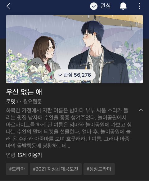 이거 순위 개낮아 이해가 안돼 솔직히; 현실 고증 ㄹㅈㄷ라 약간 거부감 느껴지는 부분도 있고 인물들 서사가 찌통이라 한명한명 다 응원하몀서 보게 됨 성장물이라 그런지 컨셉 그대로 제일 위태로운 인물이 성장할랑 말랑 밀당할 때마다 개쫄리고 넘기특해 순위 올려주새요 판녀들 취준 땜에 힘들어하는 여주랑 개같은 가정 환경 때문에 망가진 남주 구원성장 서사 궁금라면 ㄱㄱ