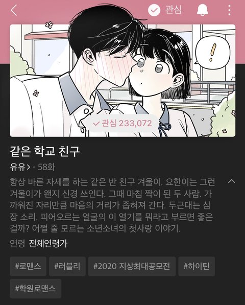 좀 유명하지 힐링하이틴학교첫사랑로맨스를 잘 버무려서 존맛탱인 작품임 메인컾도 귀엽긴 한데 나는 여기 서브가 ㅈ;ㄴ 맛잇더라 하 복귀 개같이 기다리고 있다 에피소드 형식이라 신선하고 감정선 세밀한 게 장점인 웹툰 범생이 여주랑 수줍음많은존잘 남주 연애 + 얼굴은 쿨녀인데 성격은 아기갱쥐 후배랑 장발훈남에 능글거리면서 들이대는 학생회장 선배 로맨스 궁금하몀 ㄱㄱ