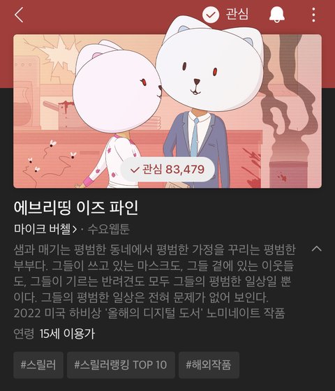 해외에서 데리고 온 웹툰이라 분량 적긴 함 근데 너므 소름이 심해서 그딴 거 별로 신경 안쓰임 저렇게 깜찍한 그림체로 스릴러 하니까 걍 개천재같음 진심 누가 해석해줫으몀 좋겓는데 다음 전개 예측하는 재미도 쏠쏠한 명작임 곰돌이 인형탈 쓰고 인위적인 말투 쓰면서 부자연스럽게 살아가는 조지 오웰 1984 웹툰 버전 스릴러 궁금하면 ㄱㄱ
