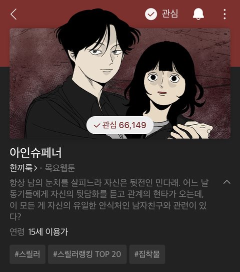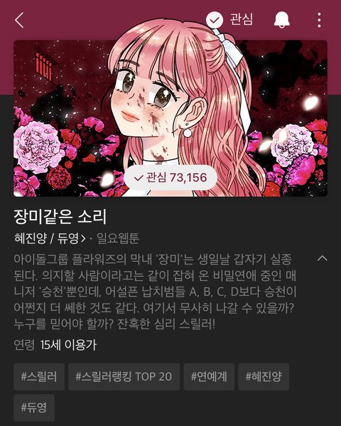 최근에 아껴두다가 정주행했는데 개읏긴 스릴러임 ㅈㄴ 어이털리는 그림체에 ㄹㅈㄷ 가스라이팅 스토리라 걍 계속 보고 싶어짐 여주 빼고 전부 의심스러움 이젠 결말 어떨지 제일 궁금한 웹툰이니까 좀 기다렷다가 몰아서 보는 거 ㅊㅊ 가스라이팅 개심한 존잘 남주한테서 벗어나고 성장하려는 소심연약여주 귱금하면 ㄱㄱ
