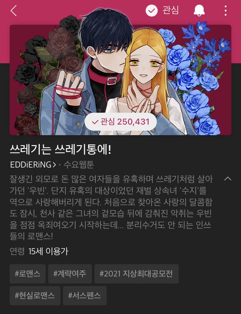 이제는 예측하기도 힘들어서 걍 넋놓고 보는 뇌잘돌아가는쓰레기들의로맨스임 그림체 개이뻐서 눈호강 개쩜 캐릭터 중에 매력 없는 애들 절대 없음 여주 심리가 너무 궁금하고 그래서 쓰레기가 쓰래기통에 들어가는지 아님 분리수거가 되는지 추리하게 되는 계략로맨스 여자 꼬시면서 돈 떼어먹던 반반한 남주가 재벌가 걍개천사인 여주 사랑하다 나락으로 굴ㄹ러갈랑 말랑 사실 그런 판도 전부 여주가 짜온 노림수역던 정신착란로맨스 궁금하면 ㄱㄱ