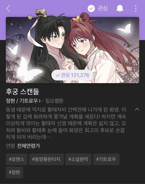 제목이 저따구라 그렇지 개욱긴 사극로맨스 원작도 맛도리였다는데 더 세련되게 내용 바뀜 가끔 이게 로맨스인지 개그물인지 ㅈㄴ게 헷갈리긴 하는데 하여간 이걱도 귀엽고 풋풋하니까 보는 거 ㅊㅊ해드림 후궁 안하고 싶어서 간택전 망치려고 기쓰는 개센 여주랑 그런 여주한테 홀려버린 유교청년 황태자의 로코 궁금하면 ㄱㄱ