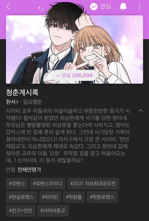 점점 상위권 웹툰 나오고 잇음 이것도 나름 상우ㅏ권인데 왜인지 이해됨 일러 개쩔고 스토리도 신박함 사이비로 엮이긴 했는데 그딴 거 미화도 딱히 없음 고딩들 동거하면서 쌍방 썸타는 거 보는 재미가 쏠쏠함 ㄹㅈㄷ로 설레니까 꼭 봐라 사기 당했는데 같이 사기 당한 사이비 집안 존잘 남주랑 동거하는 햇살여주 풋사랑 이야기 궁금하몀 ㄱㄱ