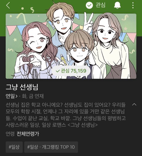 가벼운 마음으로 보기 좋은 힐링로맨스일상물임 컷툰에 에피소드 형식이라 부담 없음 대체로 귀여운 캐릭인데 가끔 급발짐해서 작가님 그림 실력 까발려질 때마다 댓글 폭발함 선생님들의 일상인데 그 사이에 숨은 쌤들끼리의 로맨스랑 말랑콩떡들 와기들 이야기 궁금하면 ㄱㄱ