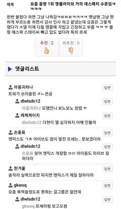 뜬금없이 요즘 아이돌 앵콜 라이브실력 글 하나가 올라온거야 전혀 이런류의 글이 올라온 적이 없거든???