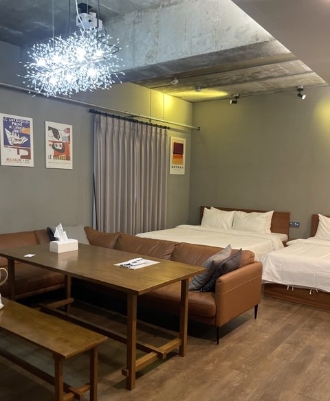 저희는 기준4명, 최대4명이라고 적혀있는 파티룸을 예약했구요, 사진과 같이 2인용 침대 한개, 1인용 침대 한개 그리고 파티룸이다보니 다같이 앉아서 놀 수 있는 쇼파가 있었습니다