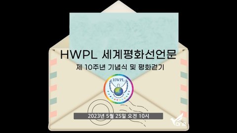 · 행사명ㅣHWPL 세계평화선언문 제10주년 기념식 및 평화 걷기· 부제ㅣ새로운 10년, 평화 제도의 정착· 일시ㅣ2023년 5월 25일(목) 오전 10시· 바로 보기https://youtu.be/2H6GIGnKHl4